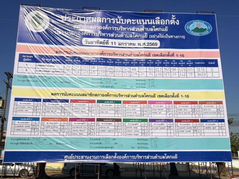 บรรยากาศการส่งหีบบัตรเลือกตั้งจากคณะกรรมการประจำหน่วยเลือกตั้ง/เจ้าหน้าที่รักษาความปลอดภัยประจำที่เลือกตั้ง จำนวน 20 หน่วย ในการเลือกตั้งสมาชิกสภาองค์การบริหารส่วนตำบลโคกแย้และนายกองค์การบริหารส่วนตำบลโคกแย้ ในวันอาทิตย์ที่ 11 มกราคม 2569 ณ อาคารอเนกประสงค์องค์การบริหารส่วนตำบลโคกแย้